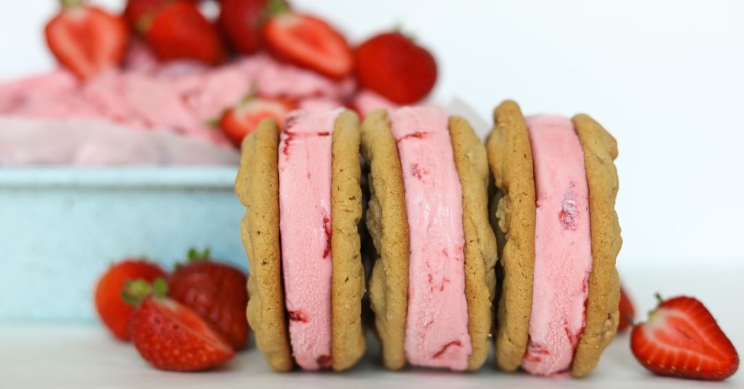 - Peanut Butter Cookie Sandwich with Strawberry Jam Gelato